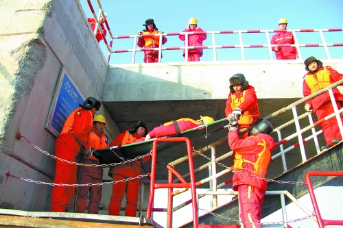 | 圖為演練人員把“傷員”平行轉(zhuǎn)移上岸。記者 朱米福 攝 |