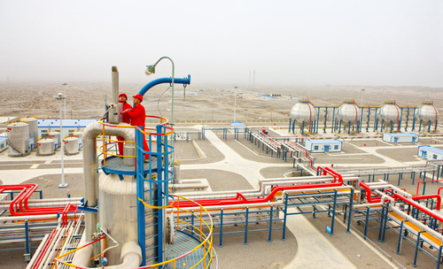 | 圖為迪那油氣處理廠技術(shù)人員在檢查放空氣閥門 |