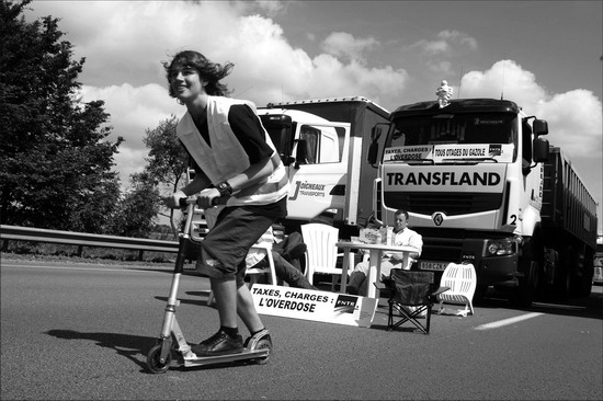 圖:汽車沒有滑板快:6月30日,法國北部的法朗潘,大批卡車司機(jī)以堵塞道路的方式抗議油價(jià)上漲,一名少年蹬著滑板車從堵塞公路的卡車旁經(jīng)過