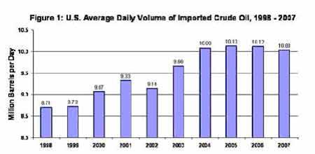 2007年美國消耗的原油近三分之二靠進口。今年前五個月美國的石油進口比2007年同期減少3%,僅5月份比去年同期下降6%。