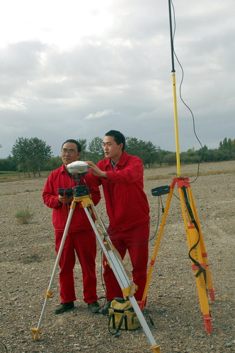 圖為測量人員正在戈壁灘上進行測量作業(yè)