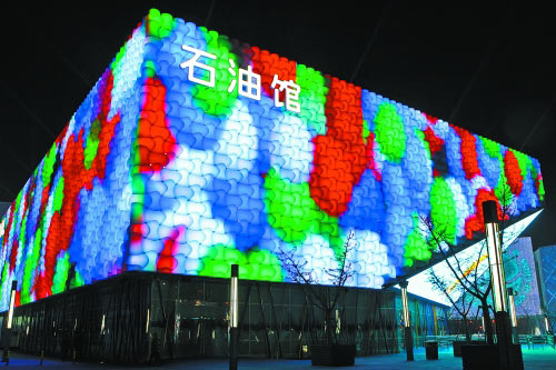 石油館的建筑外形為規(guī)則的長方體和不規(guī)則的LED高清顯示結(jié)構(gòu)結(jié)合體,外表裝飾為象征著輸油管道的管狀編織圖案,具有鮮明的石油石化行業(yè)特色。