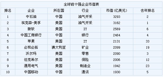 英國《金融時報》30日發(fā)布了全球五百強企業(yè)排名,中石油首次超過美國?松凸,成為全球市值最大的企業(yè),前10強中國企業(yè)有三個。