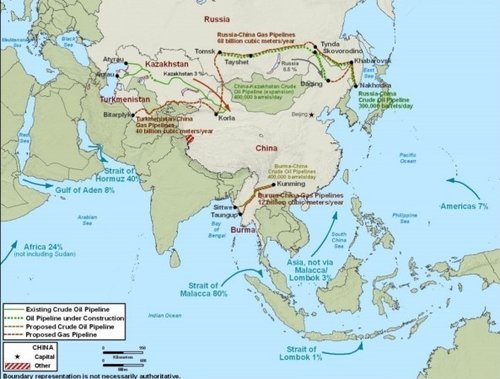 考慮到全球大量的能源儲備,但中國未來的能源需求仍將以波斯灣、非洲及南美為主,也就是說,所有的能源線路都要求海路運輸。陸路輸油管道仍不能滿足中國的巨大需求。所以海路運輸石油對中國日趨重要。
