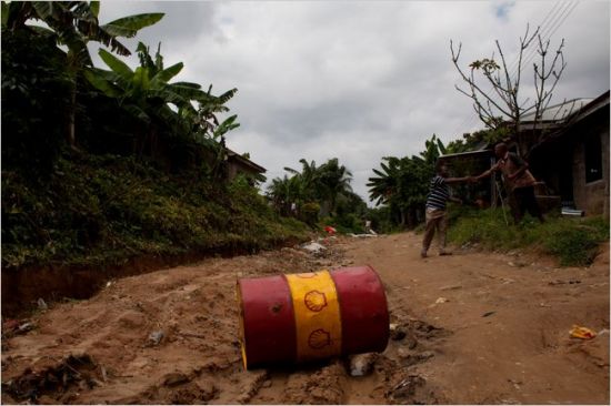 圖為尼日利亞Bodo地區(qū)泥濘的道路上廢棄的油桶