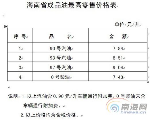 根據(jù)國(guó)家發(fā)展改革委的統(tǒng)一部署,海南汽、柴油(標(biāo)準(zhǔn)品)價(jià)格每噸均提高300元。調(diào)整后,海南90號(hào)、93號(hào)、97號(hào)汽油和0號(hào)柴油每噸最高零售價(jià)分別為9480元、10049元、10618元和8620元。