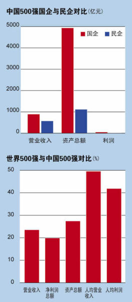 在這500家企業(yè)中,有310家國有企業(yè),其平均資產(chǎn)總額4937.8億元,是190家民營企業(yè)的4.4倍。南京大學(xué)商學(xué)院教授宋頌興昨日在接受《國際金融報》記者采訪時表示,500強榜單仍顯示了強烈的“國有特色”,“但對于中國經(jīng)濟來說,最好的局面是民企和國企齊頭并進”,因此,“在未來的發(fā)展中,相關(guān)部門或仍需出臺一定的政策,從根本上幫助中國民企的進步”。
